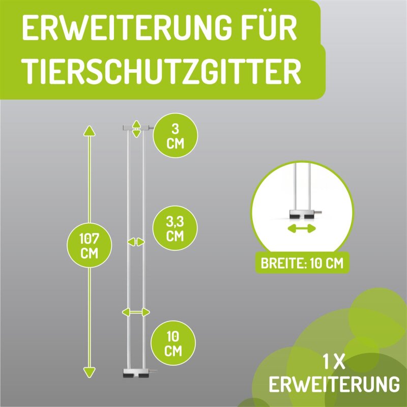 Unsere Verlängerungen für Haustiergitter sind in der Höhe von 107 cm und einer Breite von 10-40 cm erhältlich und entsprechen der DIN EN 1930-2011. Sie lassen sich mühelos mit 2 x silbernen Bolzen an das vorhandene Tierschutzgitter Zubehör anbringen. Zudem sorgt die mitgelieferte Klemmschiene, die von unten zwischen Schutzgitter und Verlängerung gesteckt wird, für eine zusätzliche Stabilität und Sicherheit.