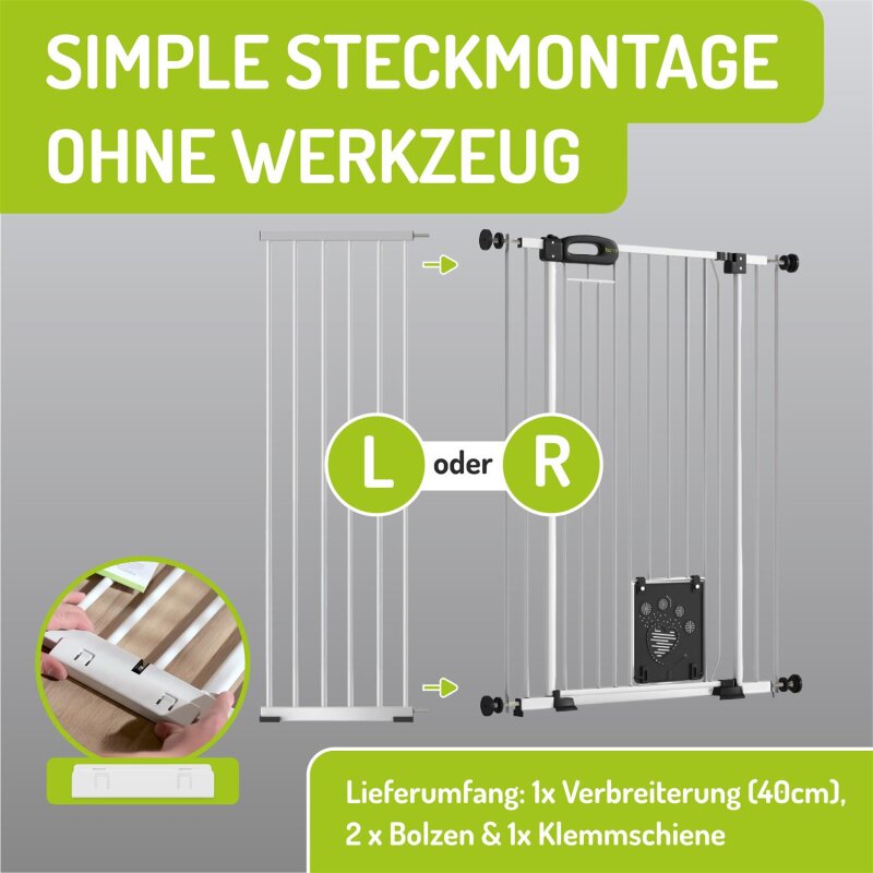 Unsere Verlängerungen für Haustiergitter sind in der Höhe von 107 cm und einer Breite von 10-40 cm erhältlich und entsprechen der DIN EN 1930-2011. Sie lassen sich mühelos mit 2 x silbernen Bolzen an das vorhandene Tierschutzgitter Zubehör anbringen. Zudem sorgt die mitgelieferte Klemmschiene, die von unten zwischen Schutzgitter und Verlängerung gesteckt wird, für eine zusätzliche Stabilität und Sicherheit.