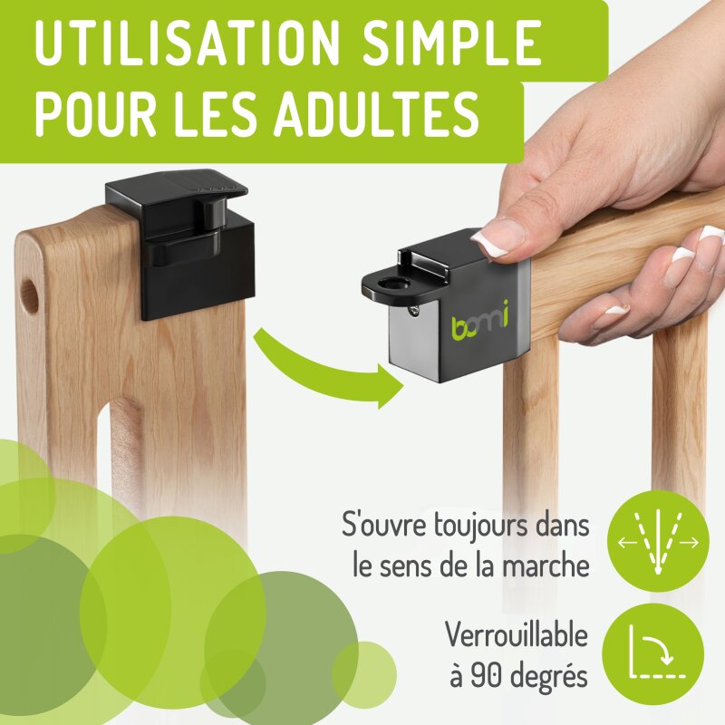 La barrière Miko XXL peut être installée par pression ou vissage, se ferme automatiquement et se verrouille d’elle-même. Elle ne s’ouvre jamais vers la descente de l’escalier – un élément essentiel pour éviter les chutes.