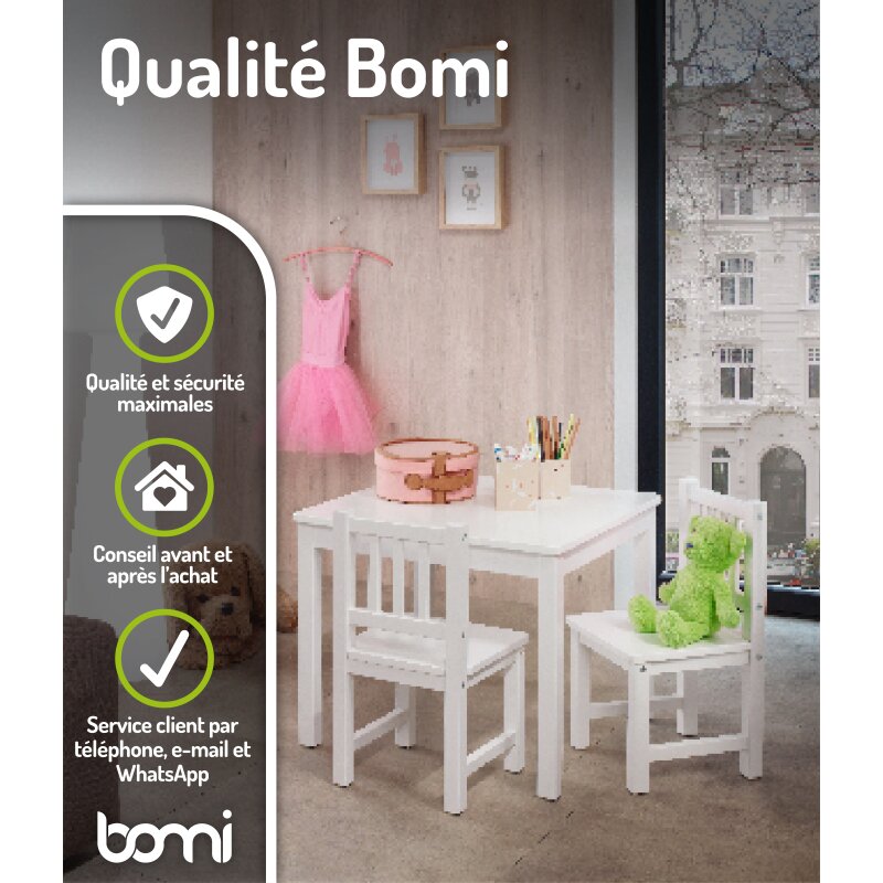 L’ensemble Amy comprend une table solide et deux chaises assorties. Grâce à une hauteur ergonomique adaptée, il offre un espace parfait pour dessiner, jouer, peindre, lire ou prendre les repas.