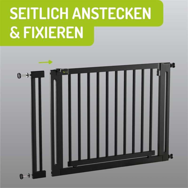 L’extension peut être installée à gauche ou à droite de la barrière, selon vos besoins. L’installation est entièrement sans outil et se fait en quelques secondes – parfaite pour les foyers recherchant une solution rapide et adaptable.