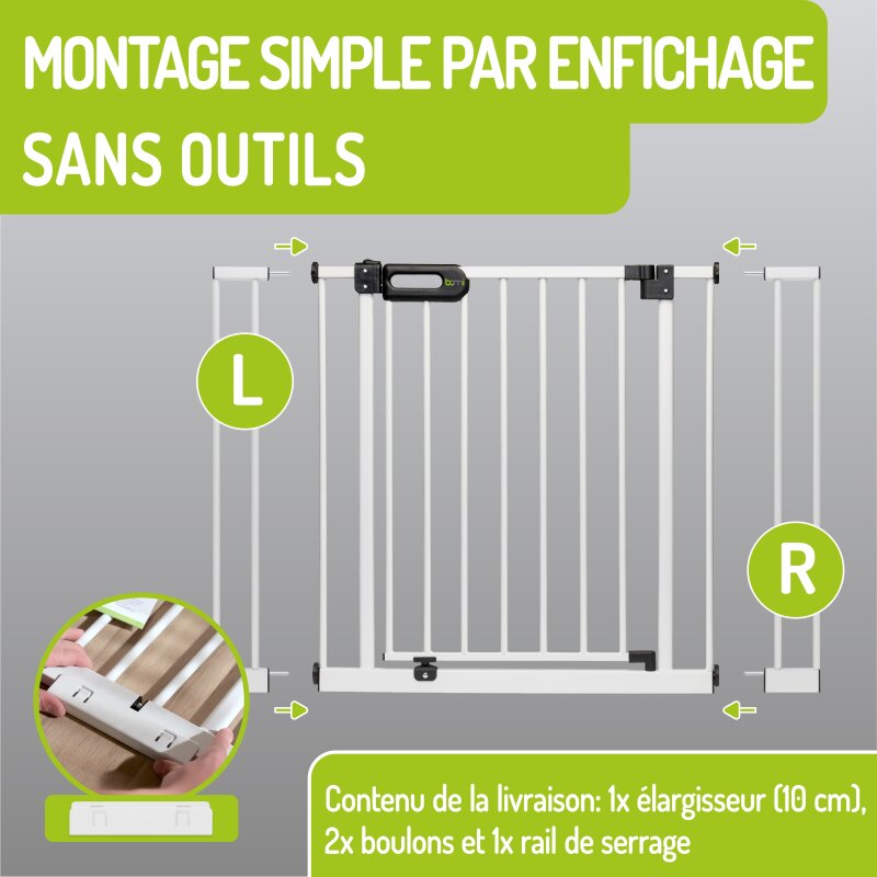 Die Verbreiterung lässt sich wahlweise links oder rechts am Kinderschutzgitter anbringen. Die Installation erfolgt komplett werkzeuglos und ist in wenigen Sekunden erledigt – ideal auch für Mietwohnungen, da keine Schrauben oder Bohrungen notwendig sind.