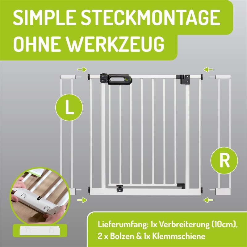 Die Türgitter Merle und Mira sind in ihrem Aufbau sehr variabel. Da sich die Türbreiten von Haus zu Haus unterscheiden können, sind diese Kindergitter in vielen Breiten erhältlich. Während für Türen oftmals nur Breiten um die 90 cm benötigt werden, treten spätestens beim Einsatz am Kamin und an überbreiten Türen Probleme bei der Befestigung auf, da das Gitter dann länger sein muss. Ebenso verhält es sich bei der Verwendung als Treppenschutz, wo das Gitter schlecht an das Geländer geklemmt werden kann. Daher gibt es für unsere Sicherheitsgitter-Modelle verschiedene Verlängerungen und Befestigungen, die einfach und ohne Werkzeug angebracht werden können. Die Anbringung der Verbreiterung ist innerhalb von einer Minute erledigt und das Gitter sofort einsatzbereit. Auch der Rückbau der Kinderabsperrung ist kein Problem.