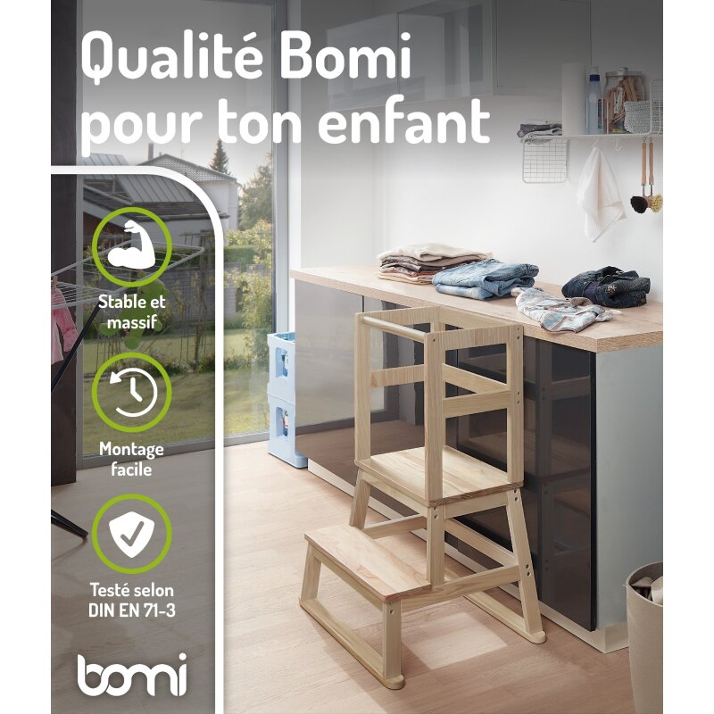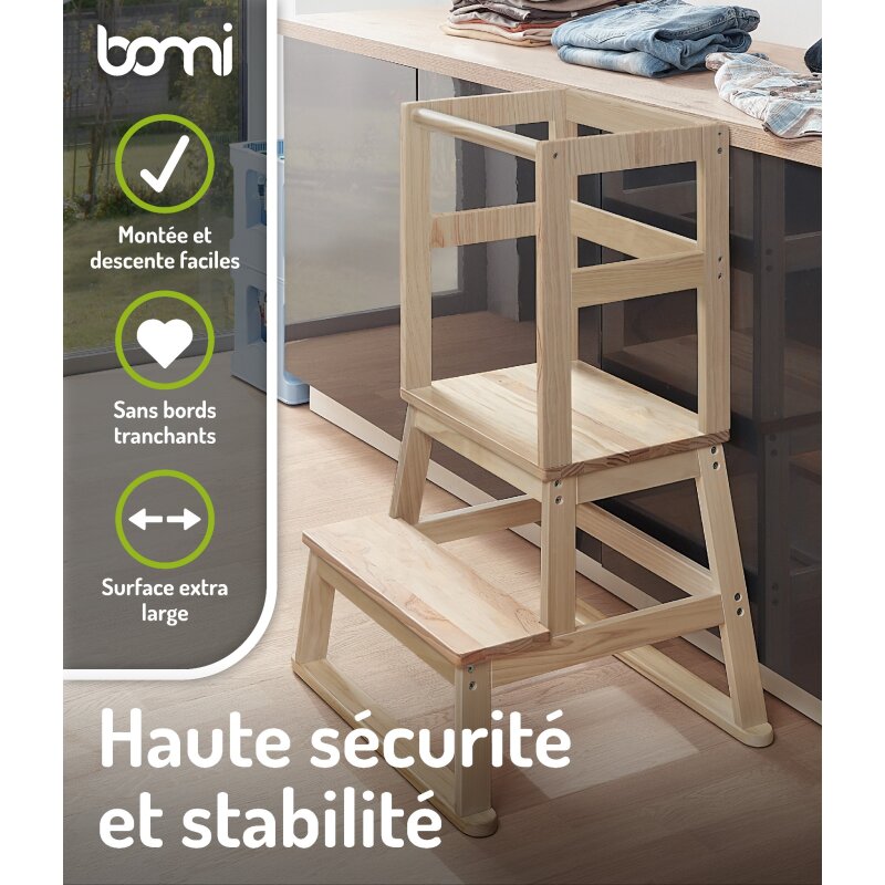 Der hochwertige Learning-Tower für Kinder der Marke BOMI ist standfest und frei von möglichen Schadstoffen. Der einfache und schnelle Aufbau ist innerhalb von 10 Minuten durchgeführt. Eine entsprechende Montageanleitung, sowie alle benötigten Schrauben sind in der Lieferung mit enthalten.